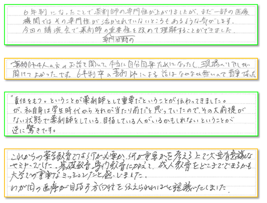 これからの日本の医療を支えるべき6年制薬学生は「薬剤師とは何か?」「薬剤師の意義は?」との悩みが少し薄れ、自分が進むべき明るい未来を見るきっかけとなりました。